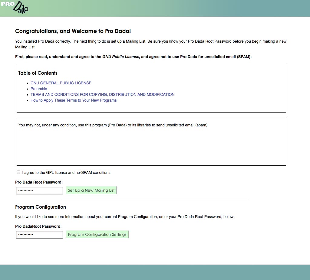 The Default Screen is what you see when you first encounter Dada Mail. If you haven't set up a mailing list yet, you'll first see a, Congratulations message, with a form to enter the Dada Mail Root Password, to create your first Dada Mail mailing list.