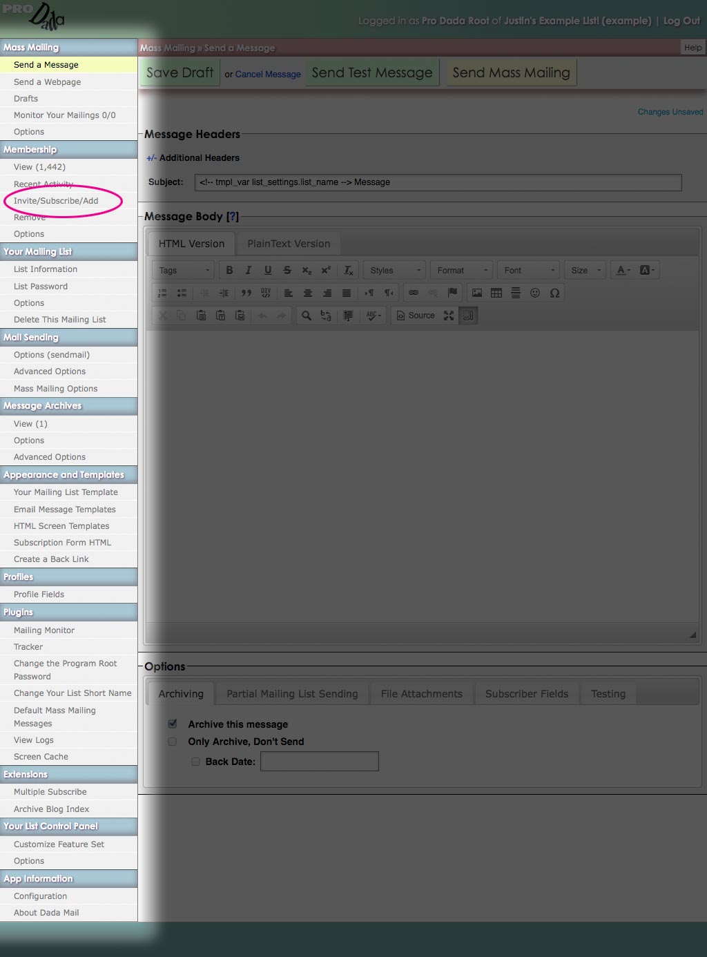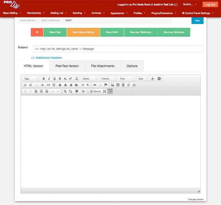 Dada Mail can handle quite a few different message formats (PlainText, HTML, Both), attachments, custom headers, mailing list message templates and a whole lot more. You don't have to know about any of these to start though, just fill out the Subject of your message, write out the message itself and press, Send Mass Mailing