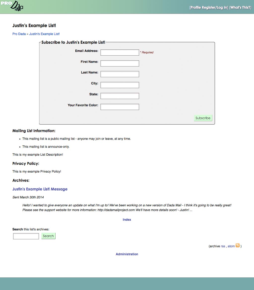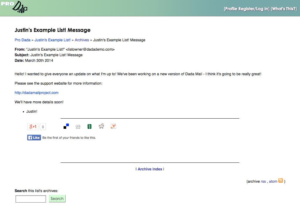 Individual archived messages will have their own screen, with a search form, to search through the mailing list's archived messages and a Dada Mail Subscription Form, so your users can send each other copies of the archived messages.