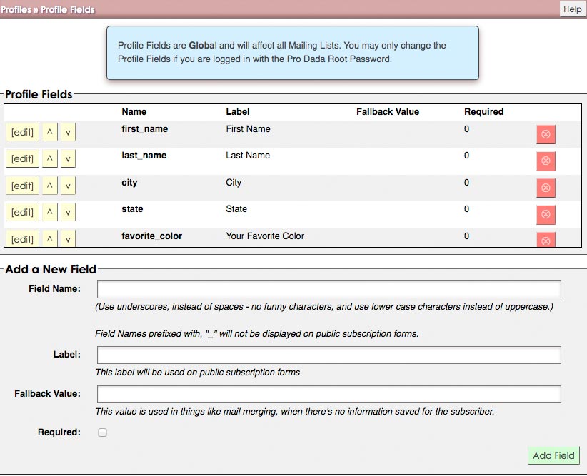 Dada Mail Subscribers can also have Profile Fields associated with them, allowing you to store things like the name, of a subscriber, or anything else you'd like to capture. Profile Fields can also be set as being required.